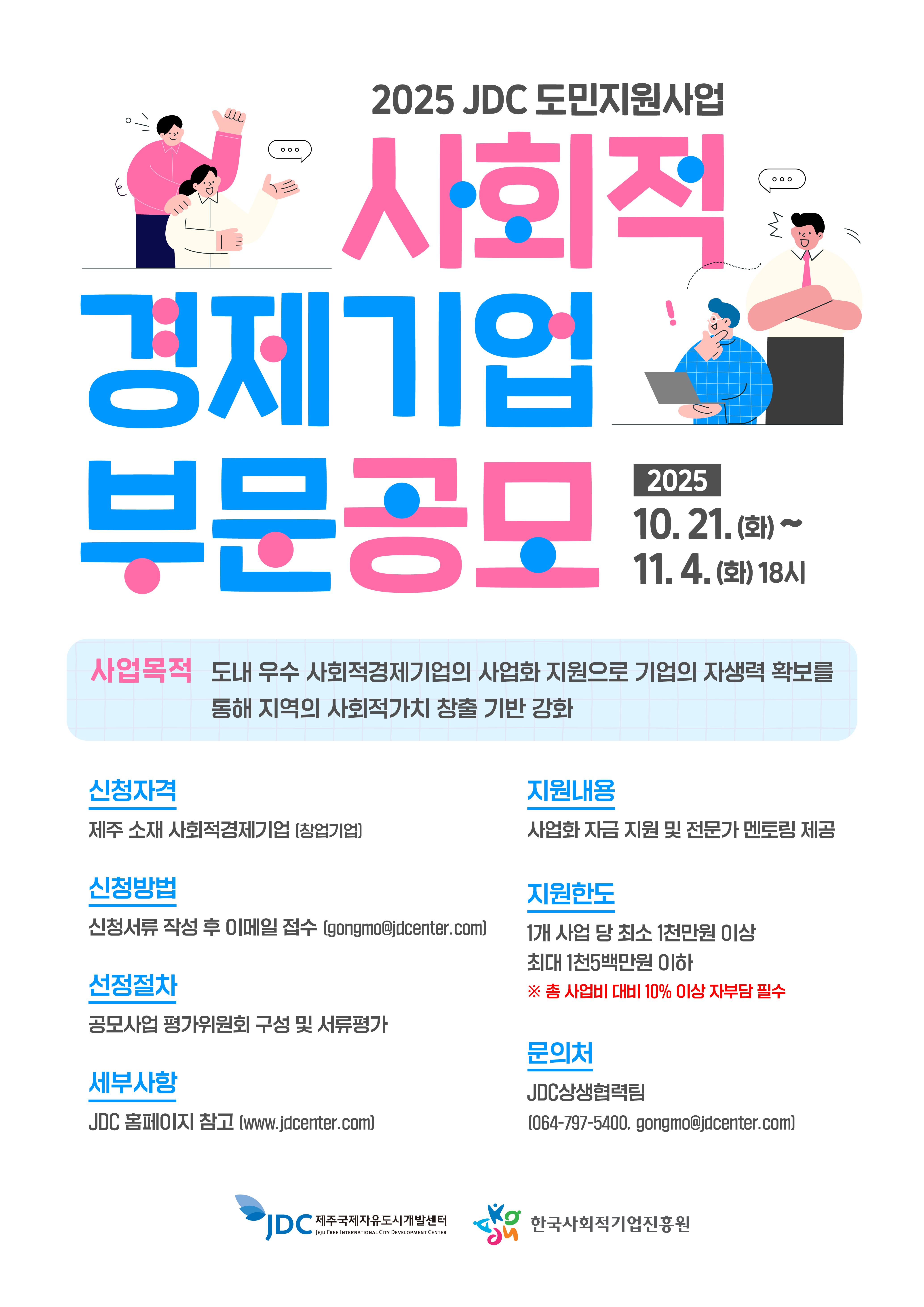 제주국제자유도시개발센터(JDC)는 지역사회의 발전 및 도내 사회 문제 해결을 위한 우수 사회적경제기업을 발굴하여 사업화를 지원하고자 2025년 JDC 도민지원사업 사회적경제기업부문 공개모집을 다음과 같이 공고하오니 많은 관심과 참여 바랍니다.